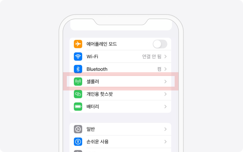 설정에서 ‘셀룰러’ 누르기
