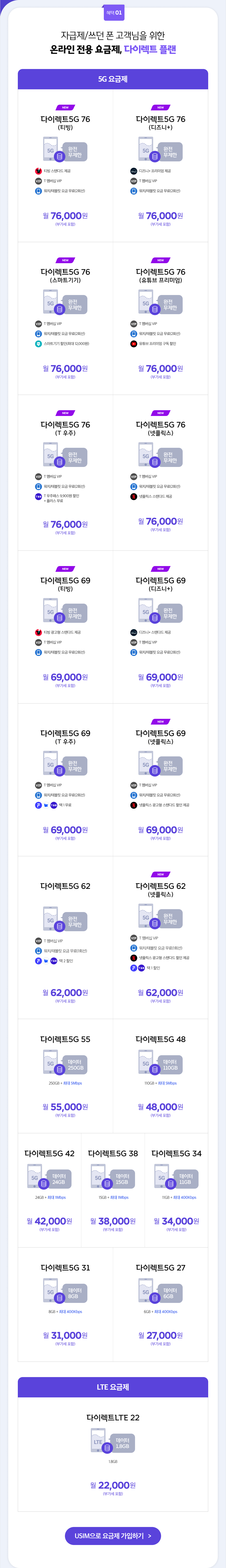 다이렉트 플랜은 T 다이렉트샵에서 신규가입, 번호이동, 기기변경 시 가입할 수 있는 온라인 전용 요금제입니다.
