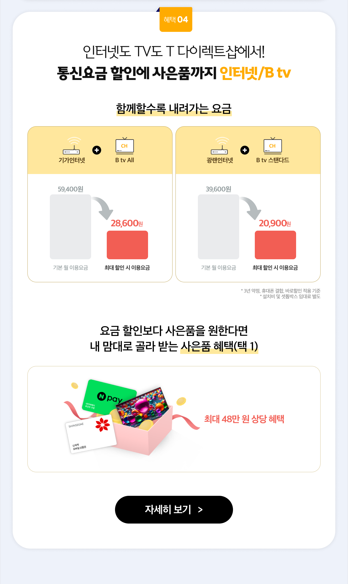 기가인터넷 + B tv All: 기본 월 이용요금 59,400원 / 최대 할인 시 이용요금 28,600원