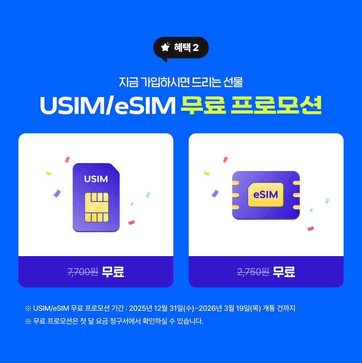 ※ USIM/eSIM 무료 프로모션 기간 : 2025년 12월 31일(수)~2026년 3월 19일(목) 개통 건까지
