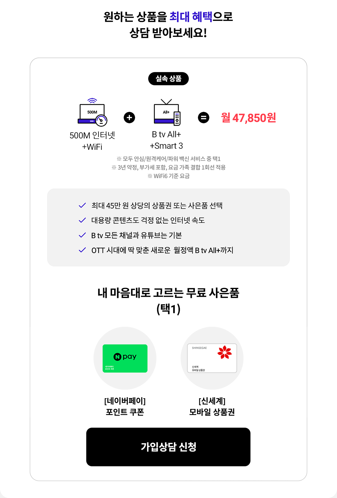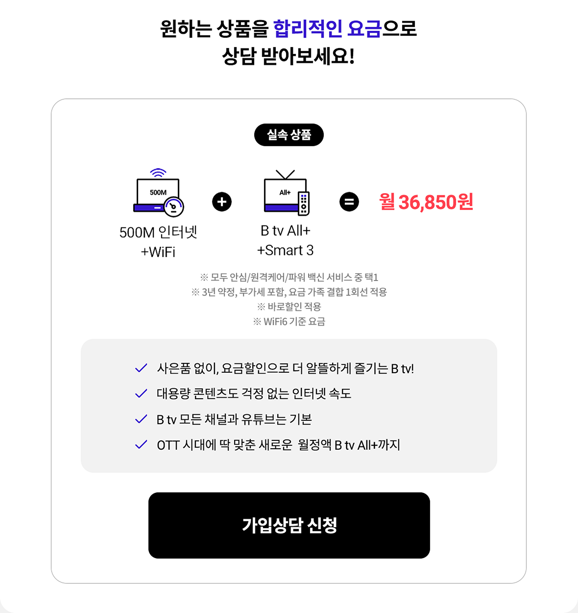 실속 상품500M 인터넷+ WIFI+ B tv All+ +Smart 3 = 월 36,850원※ 모두 안심/원격케어/파워 백신 서비스 중 택1