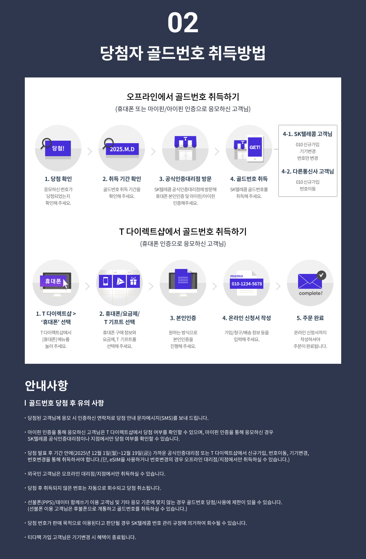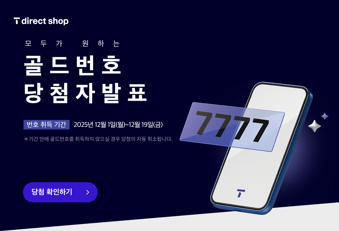 당첨 발표 후 기간 안에 (2025년 12월 1일(월) ~ 12월 19일(금)) 가까운 공식인증대리점 또는 T 다이렉트샵에서 신규가입, 번호이동, 기기변경, 번호변경을 통해 취득하셔야 합니다. (단, eSIM을 사용하거나 번호변경의 경우 오프라인 대리점/지점에서만 취득하실 수 있습니다.)