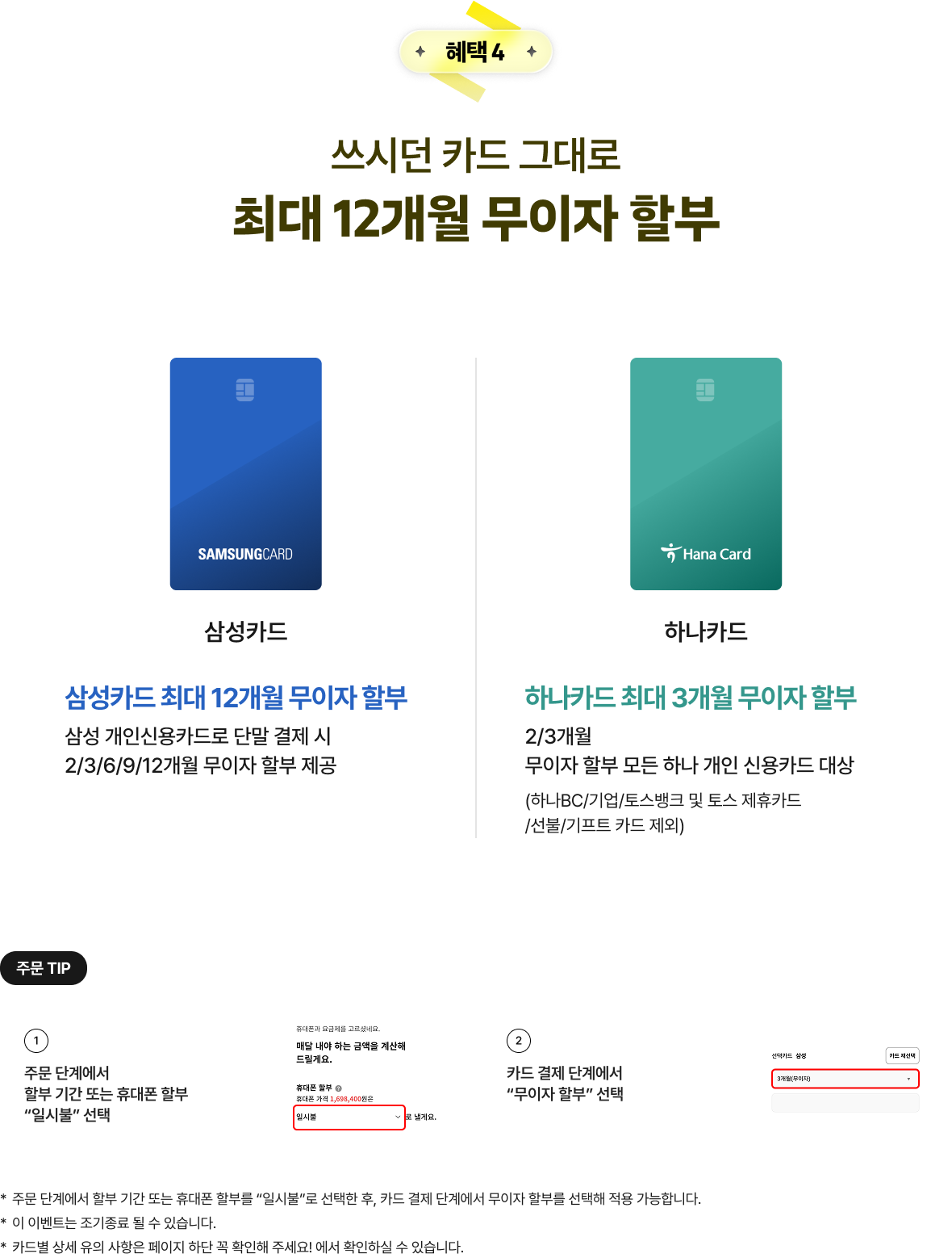 ※ 주문 단계에서 할부 기간 또는 휴대폰 할부를 “일시불”로 선택한 후, 카드 결제 단계에서 무이자 할부를 선택해 적용 가능합니다.