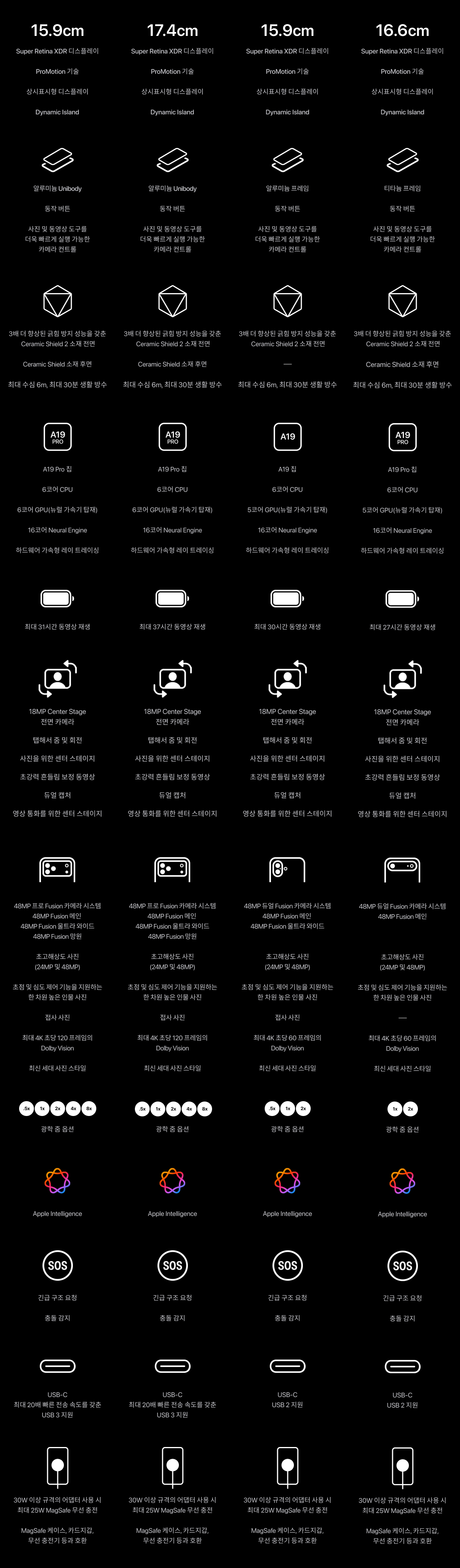 | 15.9cm Super Retina XDR 디스플레이 ProMotion 기술 상시표시형 디스플레이 Dynamic Island | 17.4cm Super Retina XDR 디스플레이 ProMotion 기술 상시표시형 디스플레이 Dynamic Island | 15.9cm Super Retina XDR 디스플레이 ProMotion 기술 상시표시형 디스플레이 Dynamic Island | 16.6cm Super Retina XDR 디스플레이 ProMotion 기술 상시표시형 디스플레이 Dynamic Island |