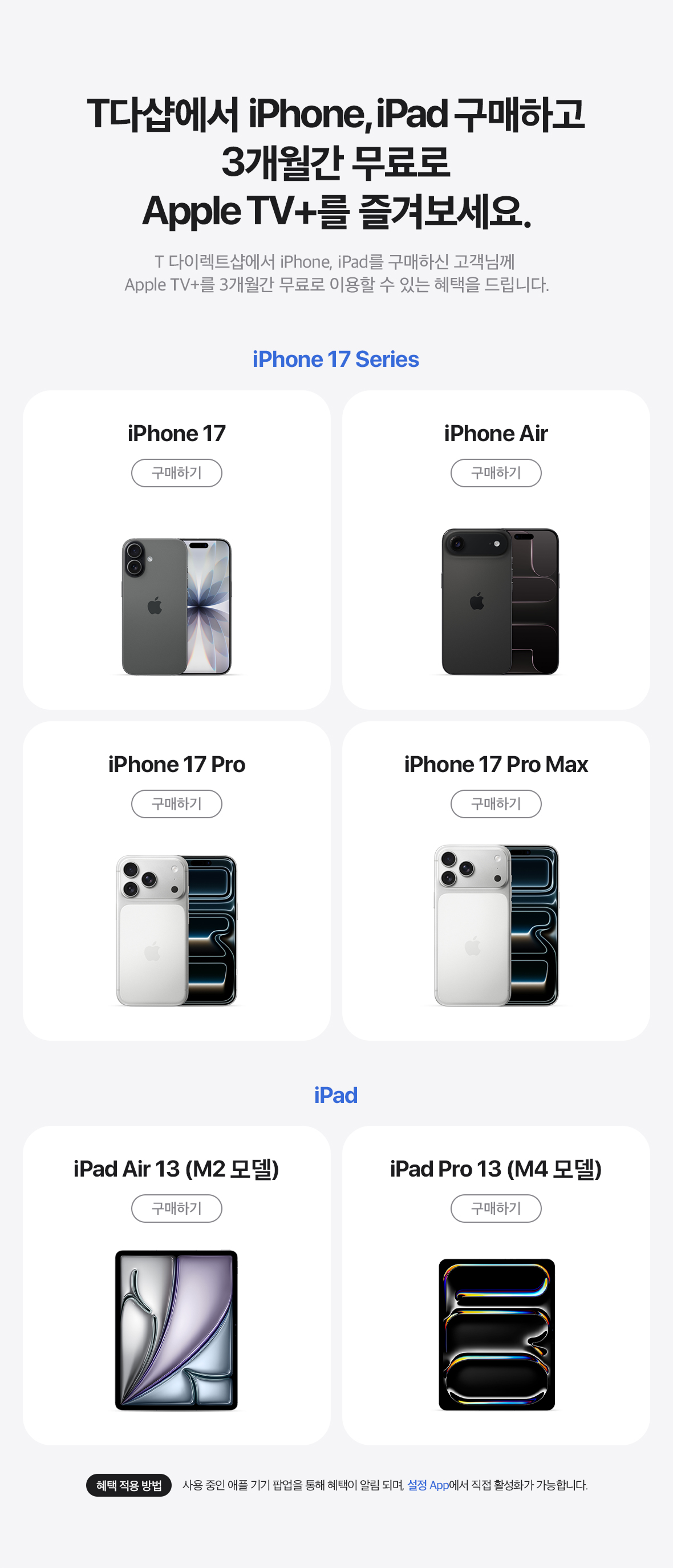 T 다이렉트샵에서 iPhone, iPad를 구매하신 고객님께 Apple TV+를 3개월간 무료로 이용할 수 있는 혜택을 드립니다.