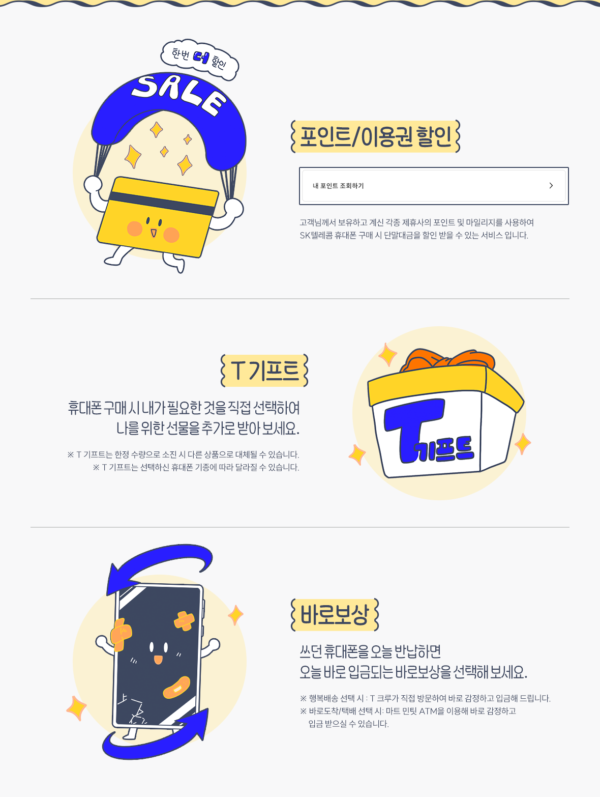 - 포인트/이용권 할인 고객님께서 보유하고 계신 각종 제휴사의 포인트 및 마일리지를 사용하여 SK텔레콤 휴대폰 구매 시 단말대금을 할인 받을 수 있는 서비스입니다.