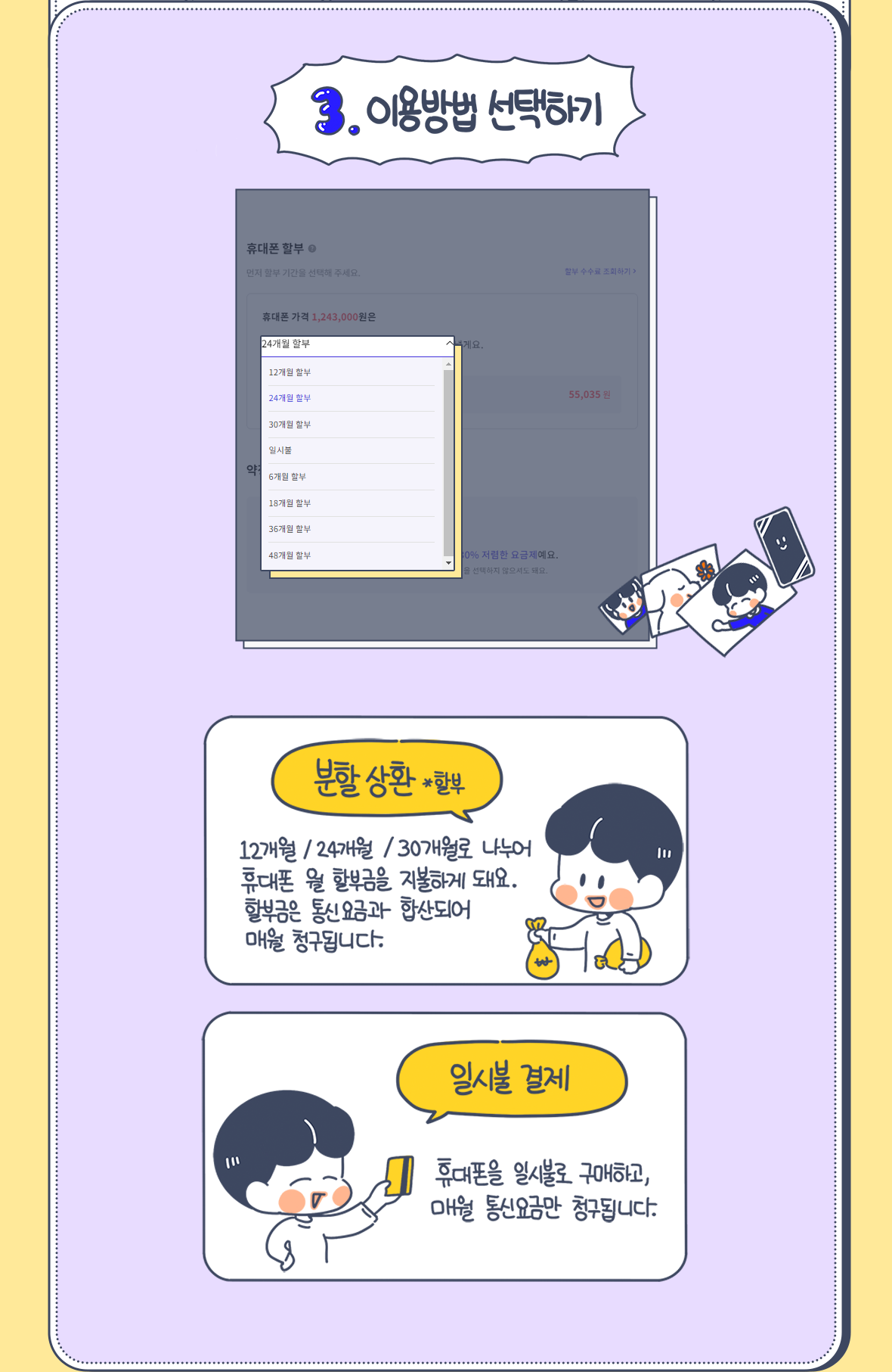 - 분할 상환 *할부 12개월/24개월/30개월로 나누어 휴대폰 월 할부금을 지불하게 돼요. 할부금은 통신요금과 합산되어 매월 청구됩니다.