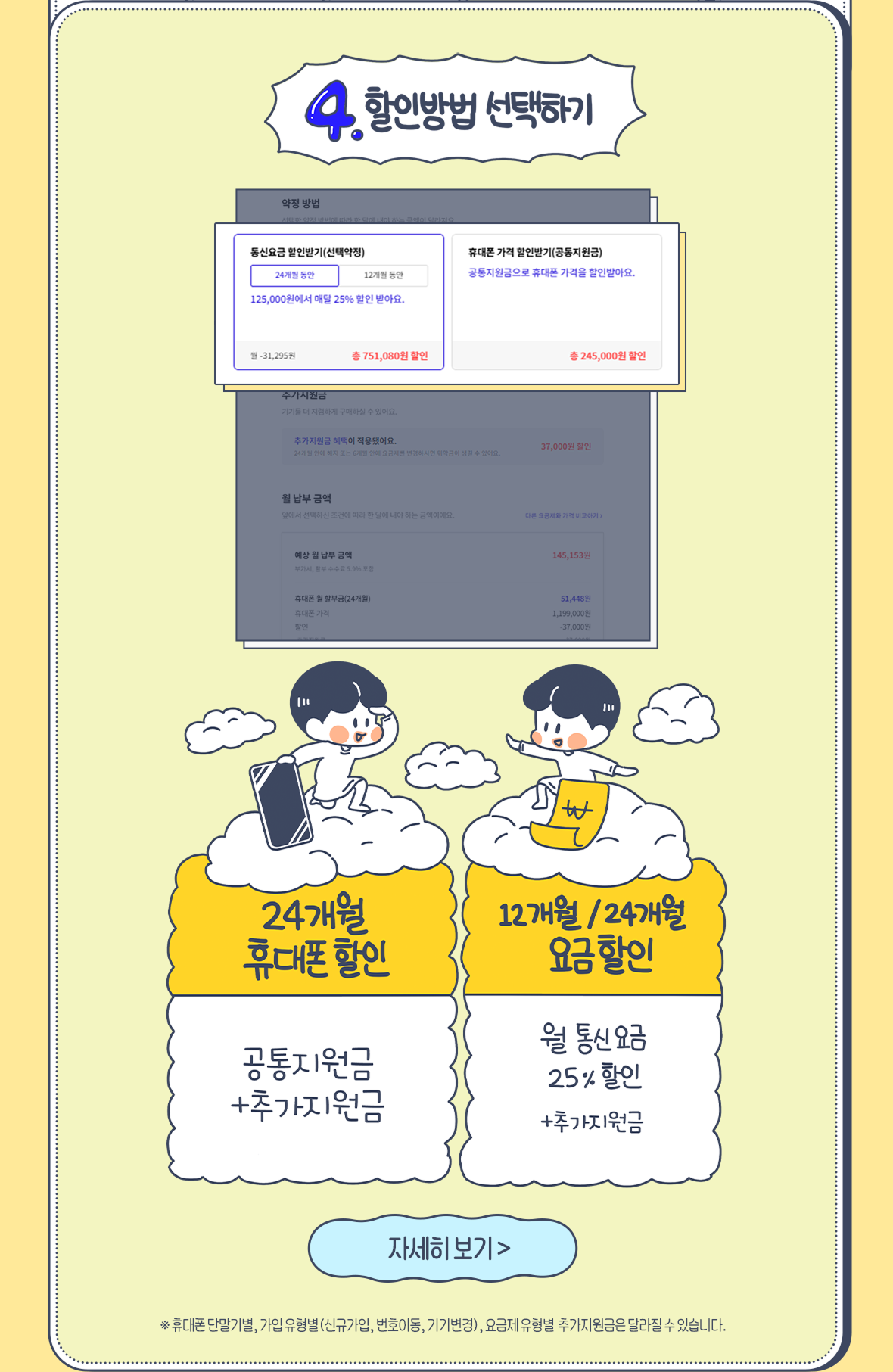 - 12개월/24개월 요금할인 월 통신요금 25%할인+추가지원금