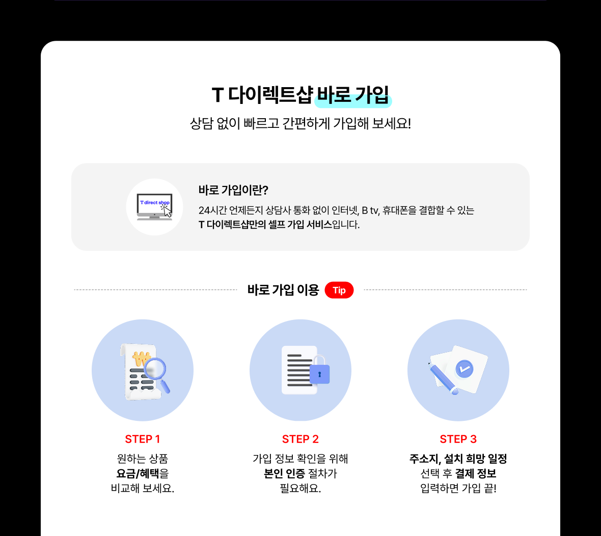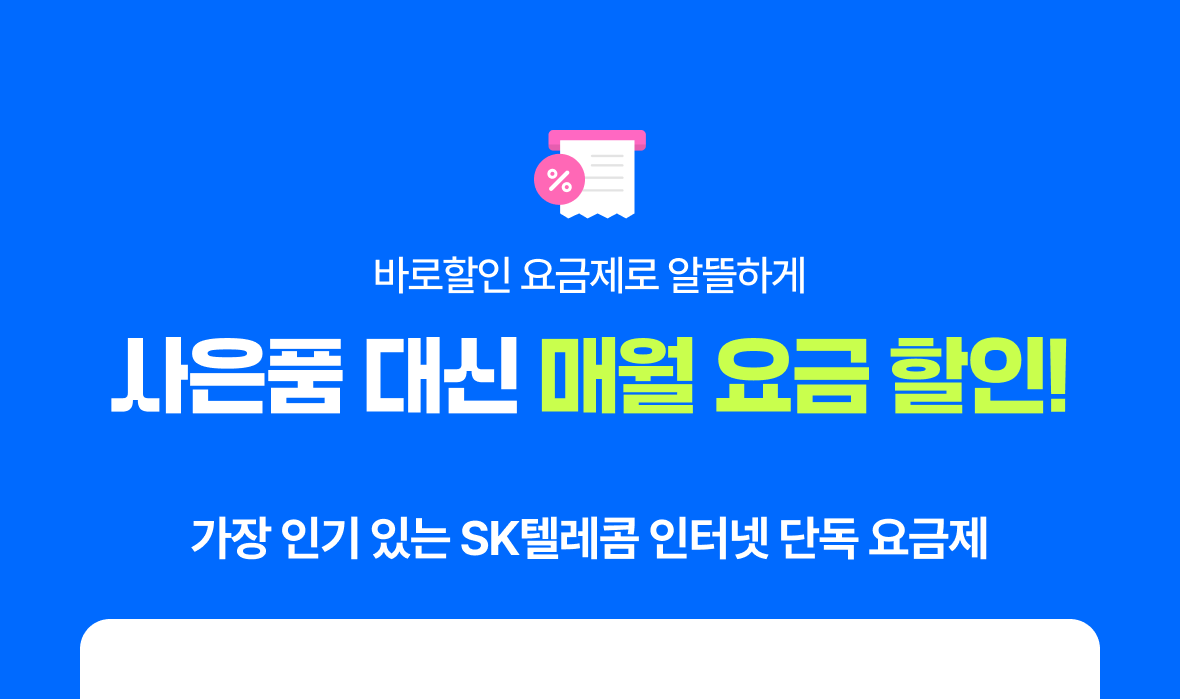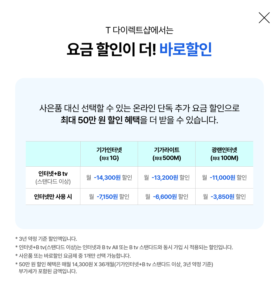 바로할인 요금제란? 인터넷/ B tv 온라인 가입 시 사은품 대신 선택할 수 있는 온라인 단독 추가 요금 할인으로 최대 30% 할인 혜택을 더 받을 수 있습니다.