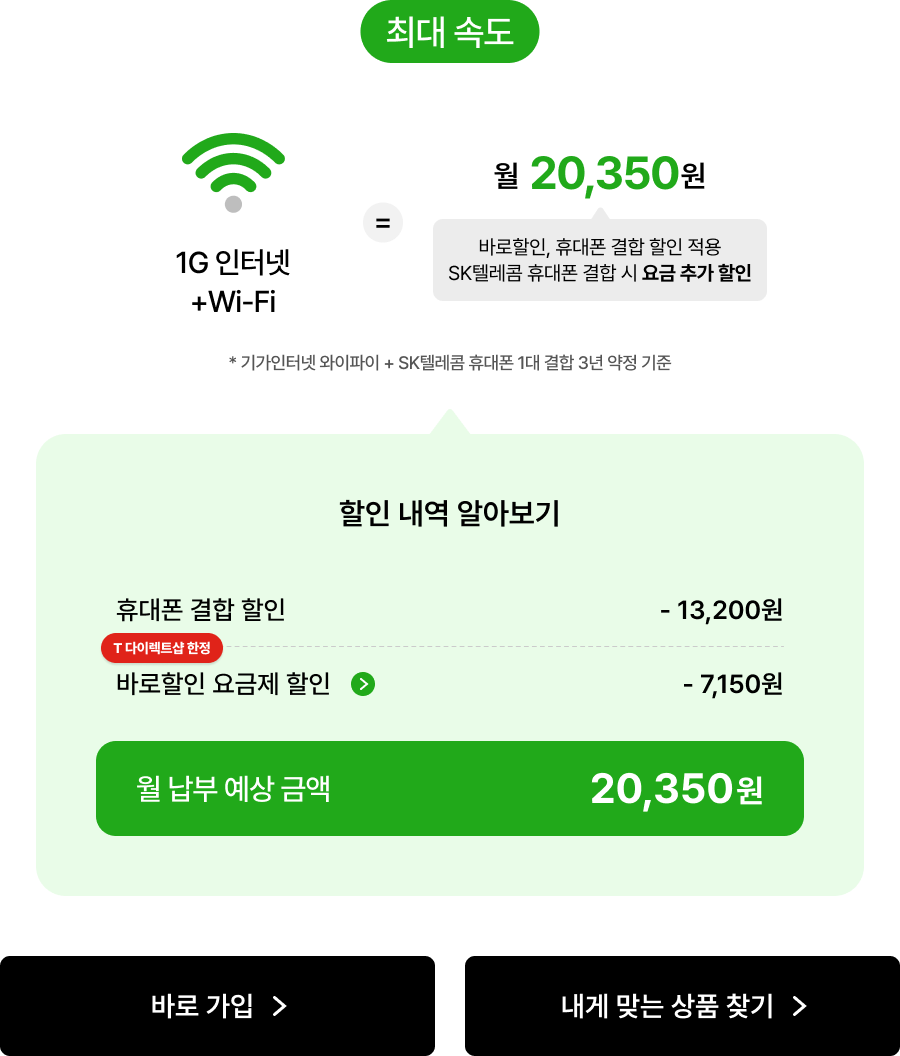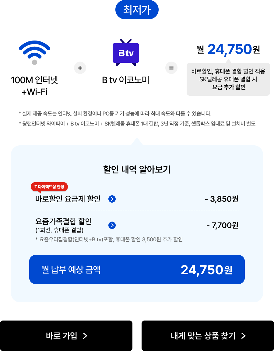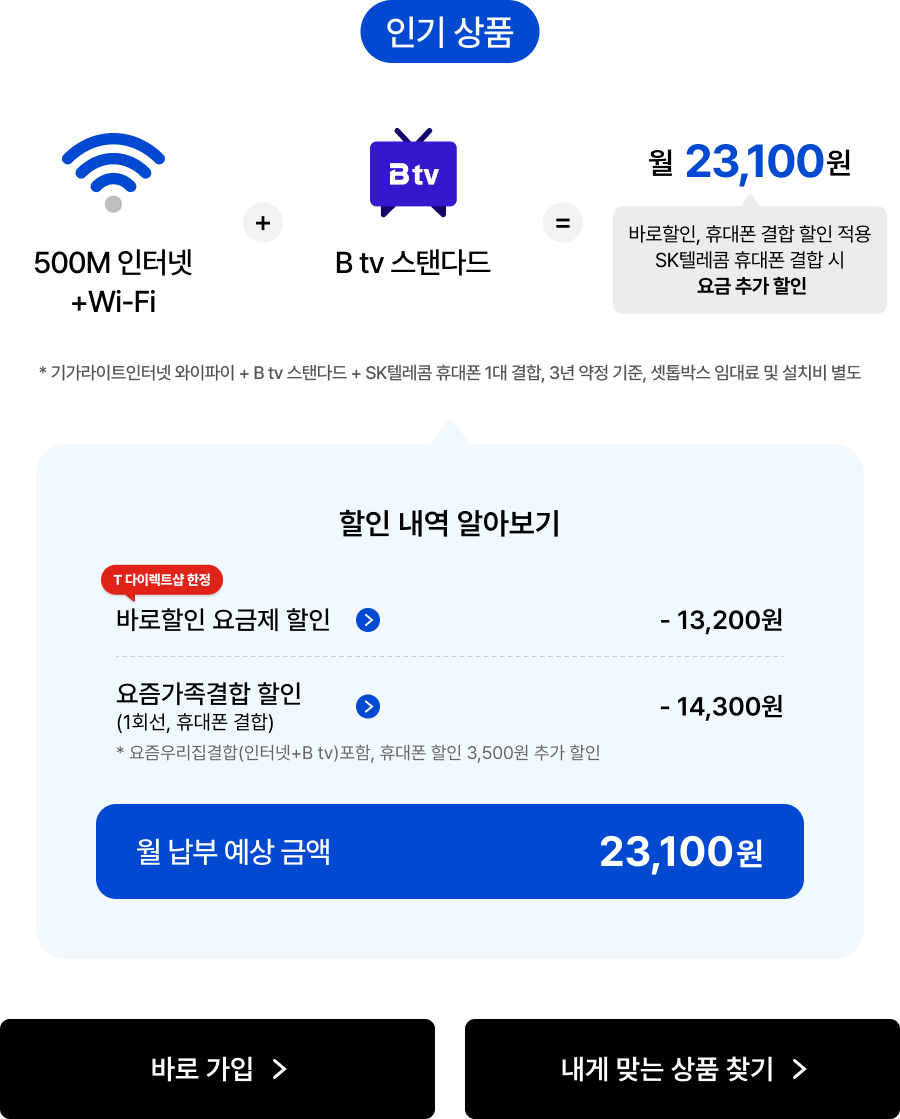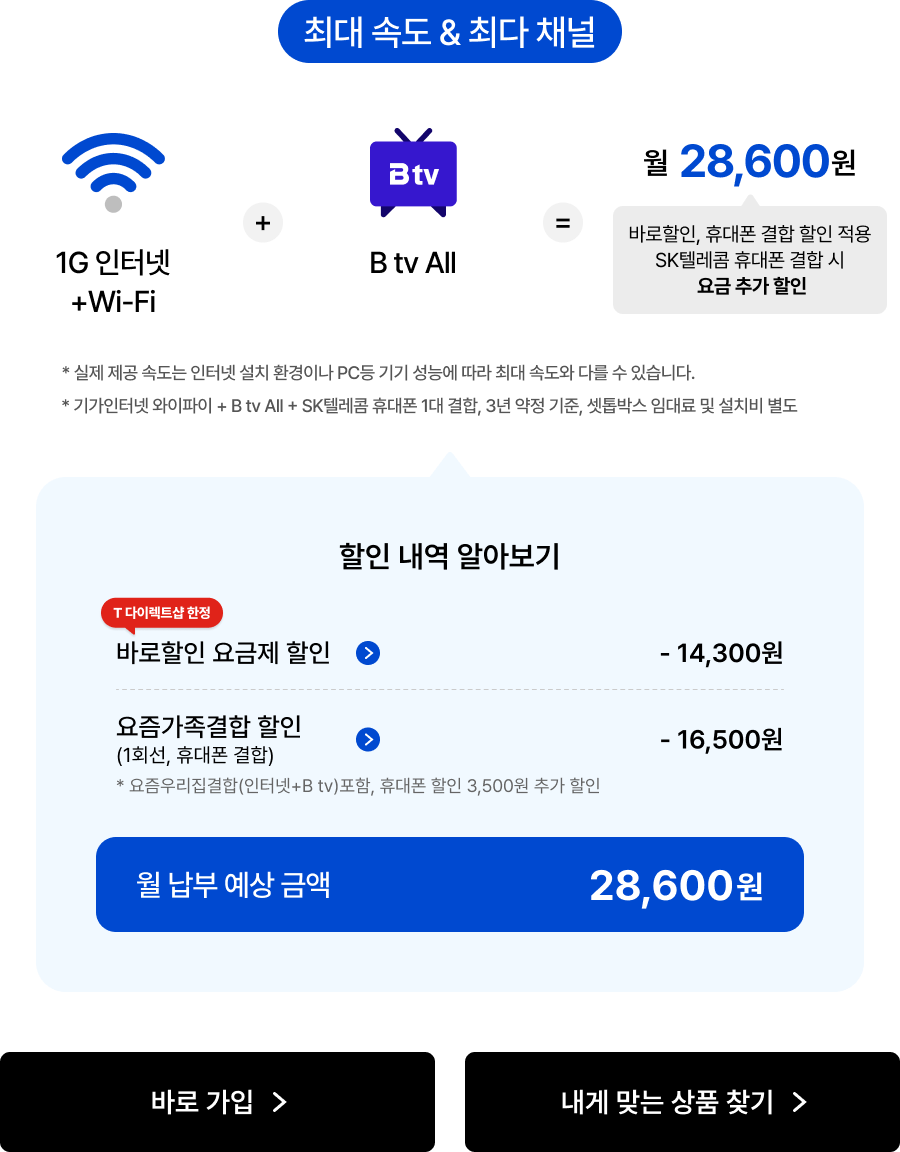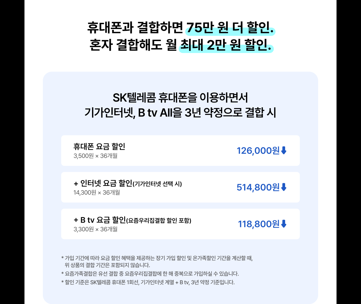 매월 최대 -14,300원 요금 할인 * 기가인터넷 와이파이+B tv 스탠다드+SK텔레콤 휴대폰 1대 결합 3년 약정 기준, 부가세 포함