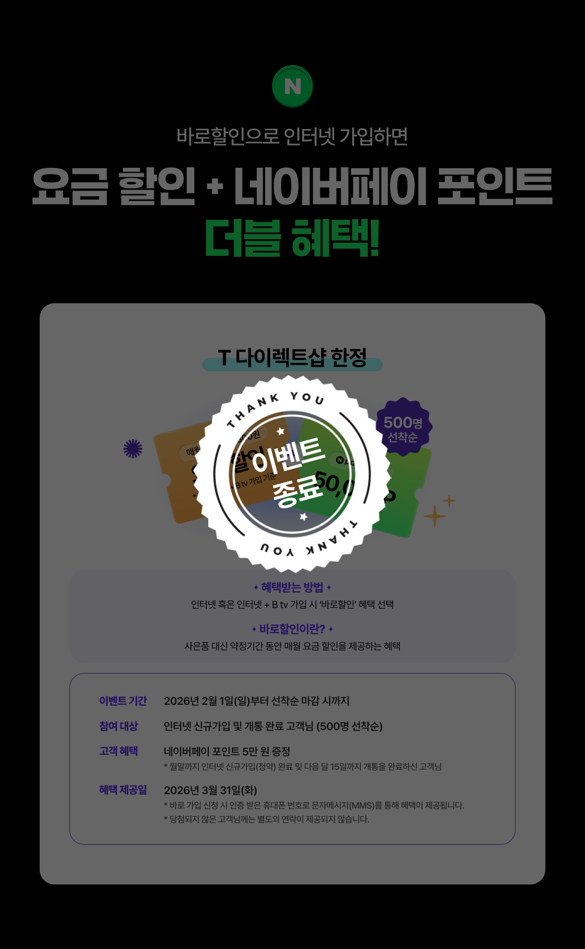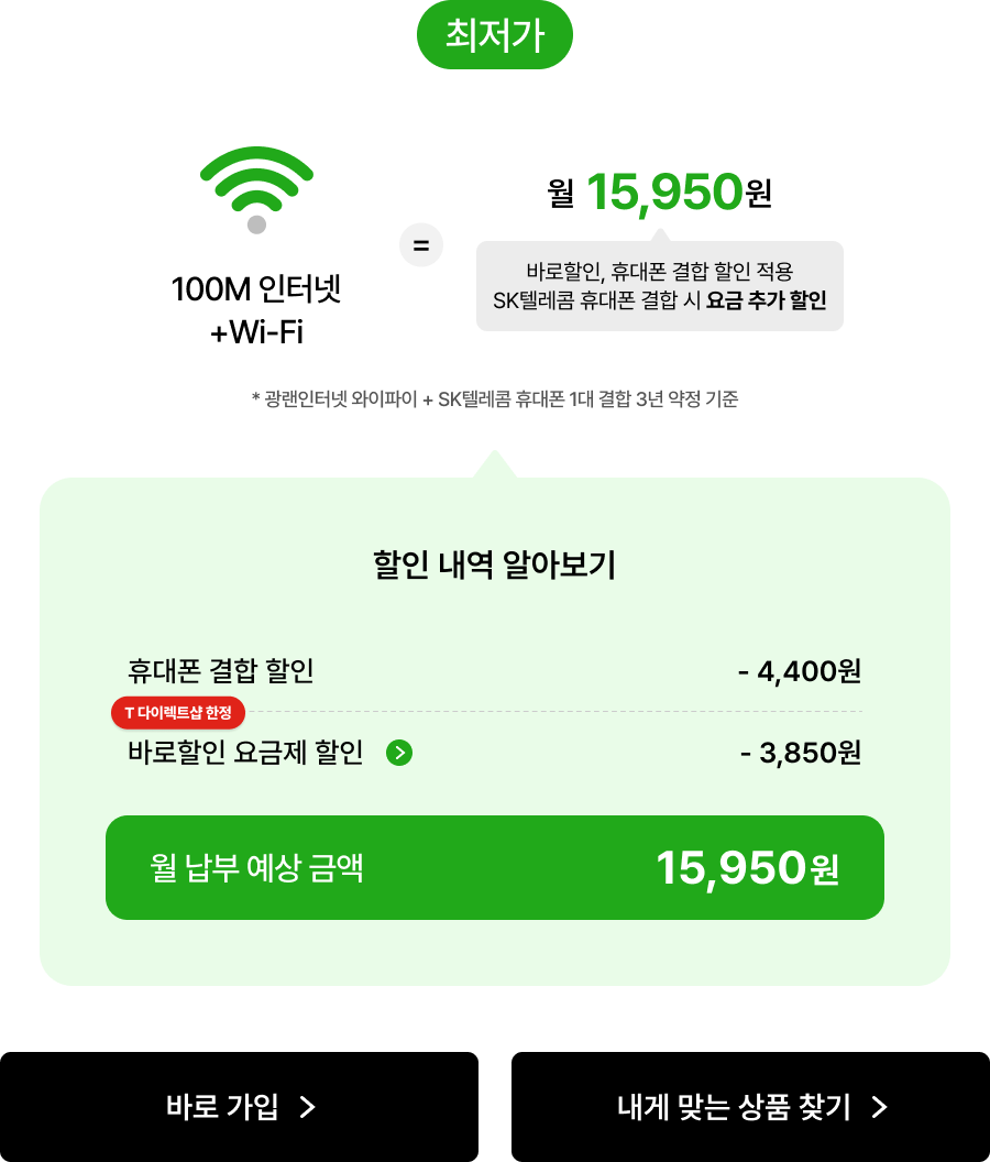 | 인터넷만 사용 시 | 월 -7,150원 할인 | 월 -6,600원 할인 | 월 -3,850원 할인 |