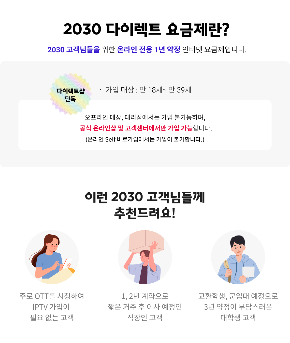 2030 고객님들을 위한 온라인 전용 1년 약정 인터넷 요금제입니다.
