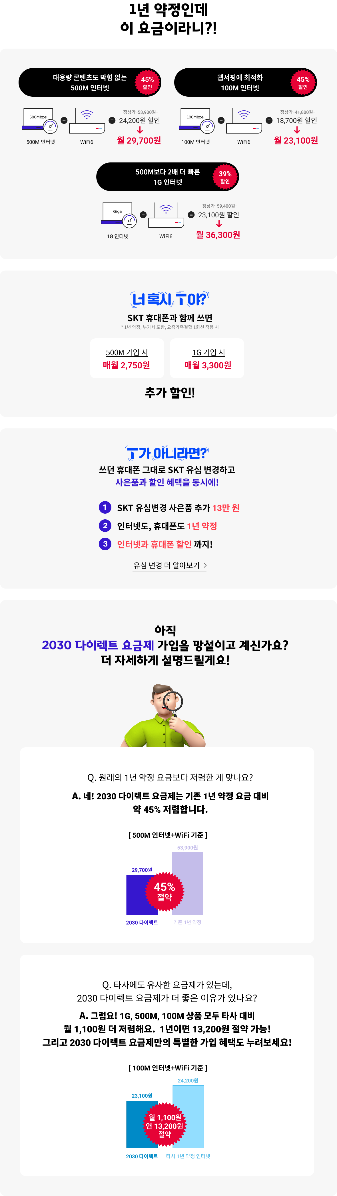 - 500M인터넷 + WiFi 기준 (45% 절약): 기존 1년 약정 53,900원 / 2030 다이렉트 29,700원