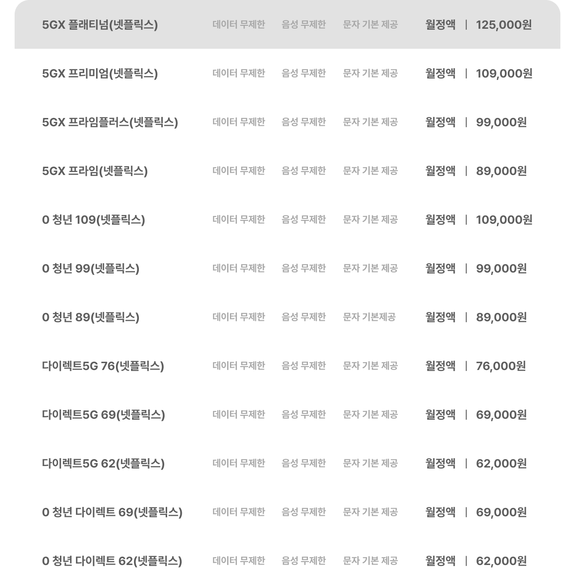 | 5GX 플래티넘(넷플릭스) | 데이터 무제한 | 음성 무제한 | 문자 기본제공 | 월정액ㅣ125,000원 |