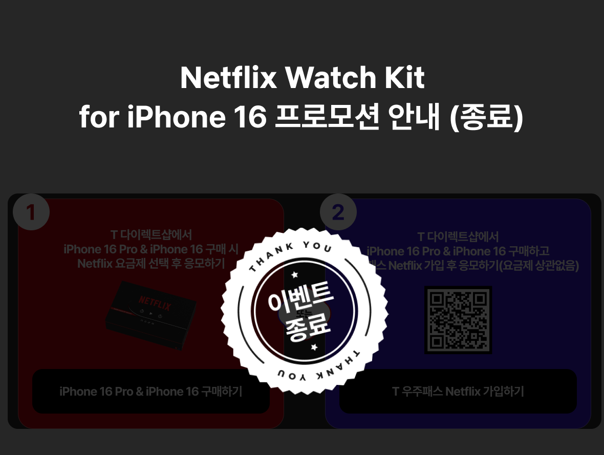 - T 다이렉트샵에서 iPhone 16 Pro & iPhone 16를 일반 구매하신 고객님도 2024년 9월 20일(금)~9월 27일(금)에 추가 응모 가능하며 총 2,000명에게 Netflix Watch Kit를 드립니다.