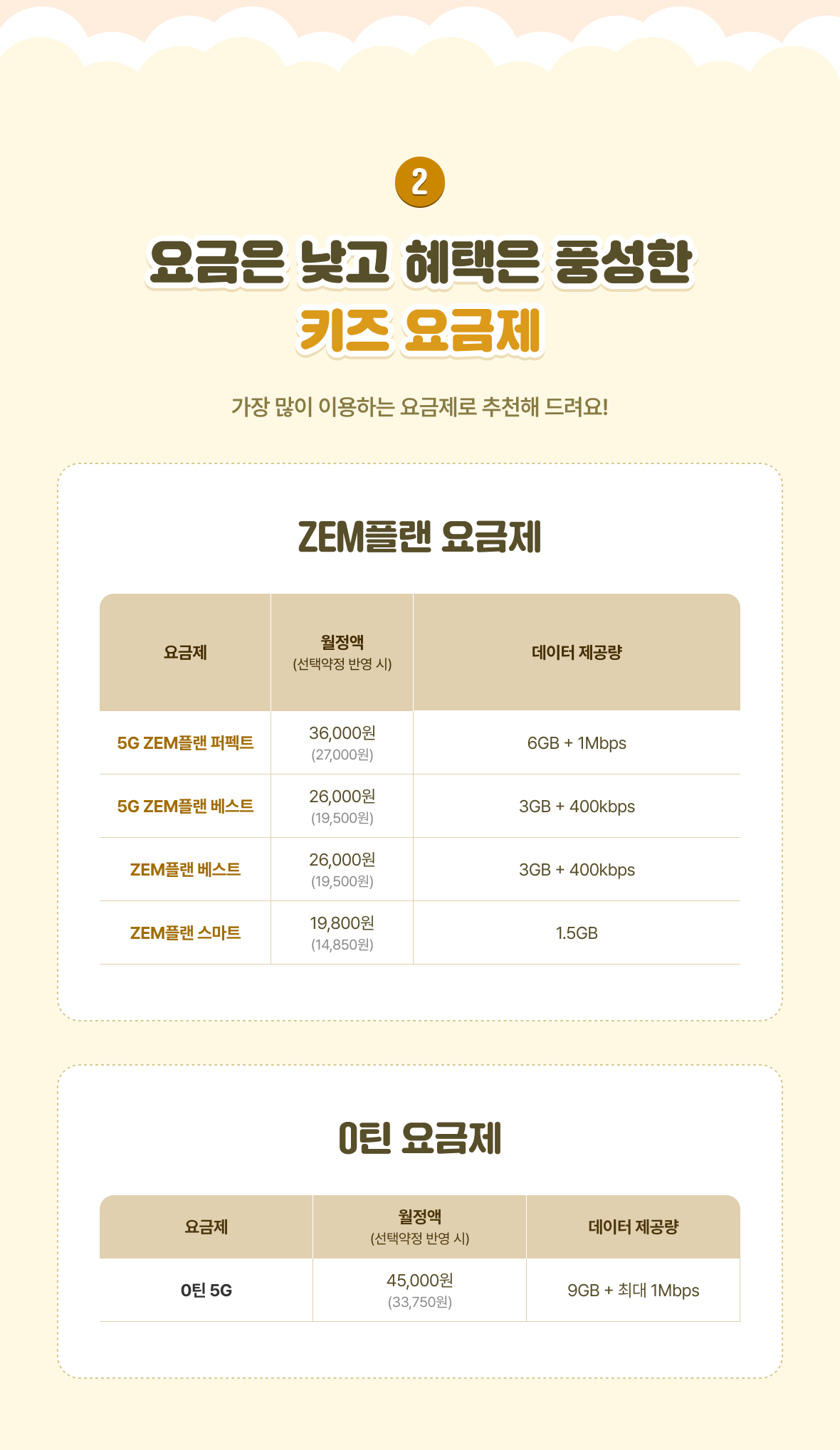 | ZEM플랜 스마트 | 19,800원(14,850원) | 1.5GB |