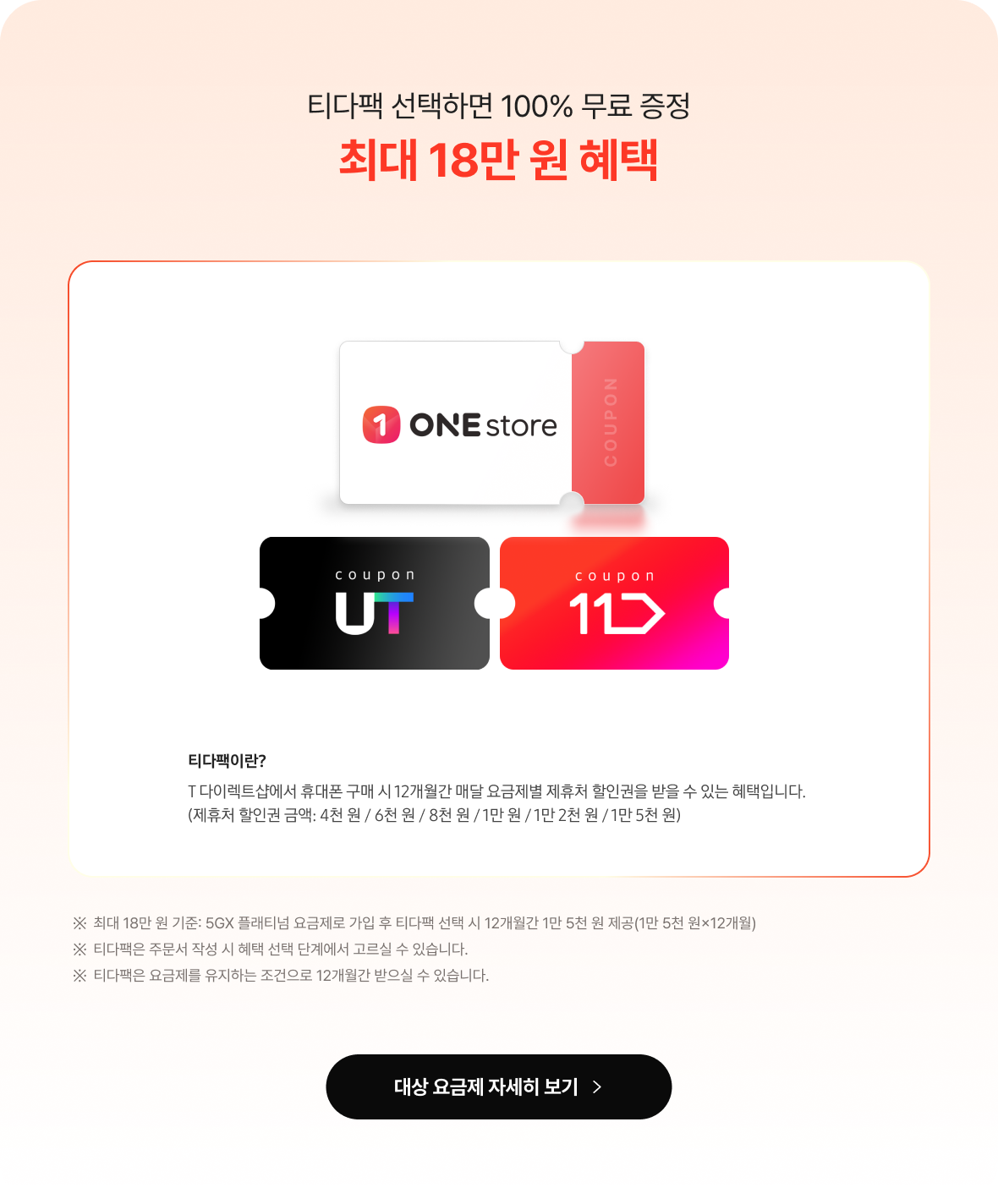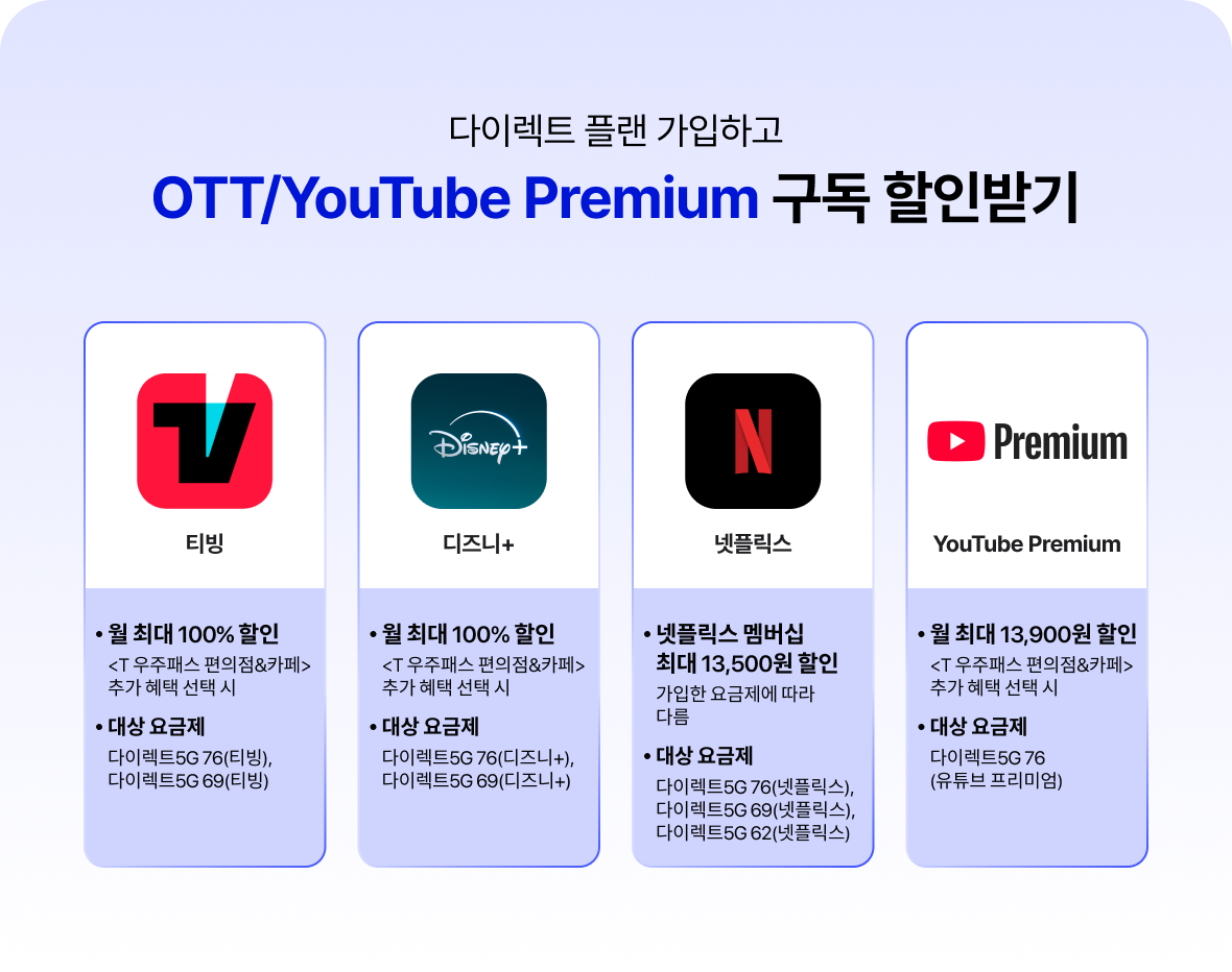※ T 우주, 넷플릭스, 스마트기기, 유튜브 프리미엄, 디즈니+, 티빙 등 혜택 요금제 포함