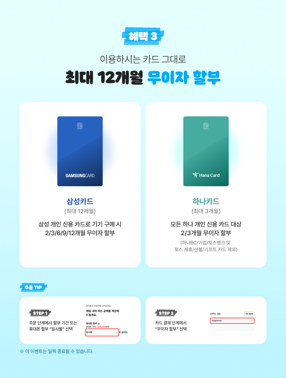 - 삼성 개인 신용 카드로 기기 구매 시 2/3/6/9/12개월 무이자 할부