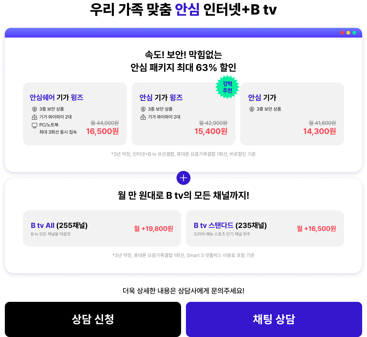 *3년 약정, 인터넷+B tv 유선결합, 휴대폰 요즘가족결합 1회선, 바로할인 기준