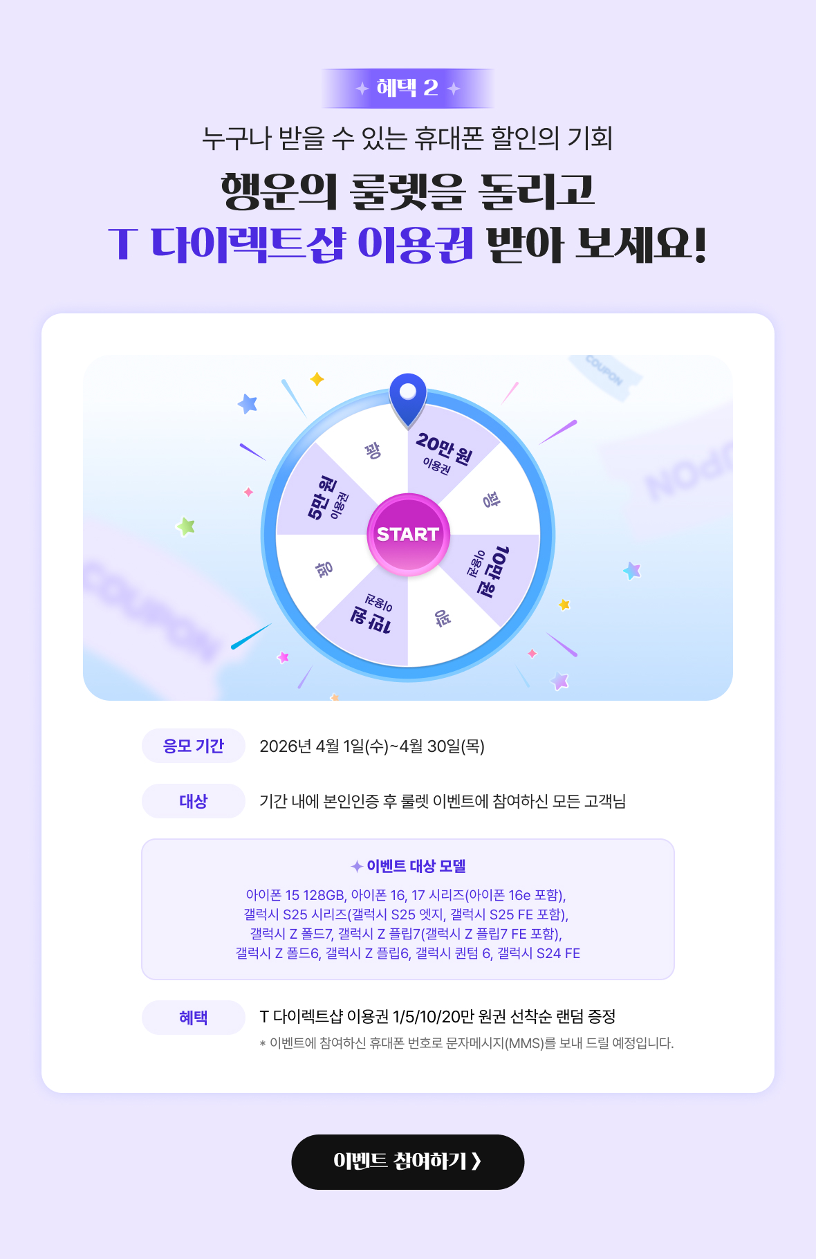 T 다이렉트샵 룰렛 이벤트는 2026년 4월 1일(수)~4월 30일(목)까지 휴대폰 번호당 1회만 참여 가능합니다.